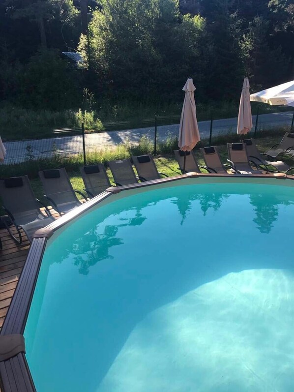 Hiihtämiseen sopiva vuoristokohde, jonka palveluihin/mukavuuksiin kuuluvat ulkouima-allas ja ravintola