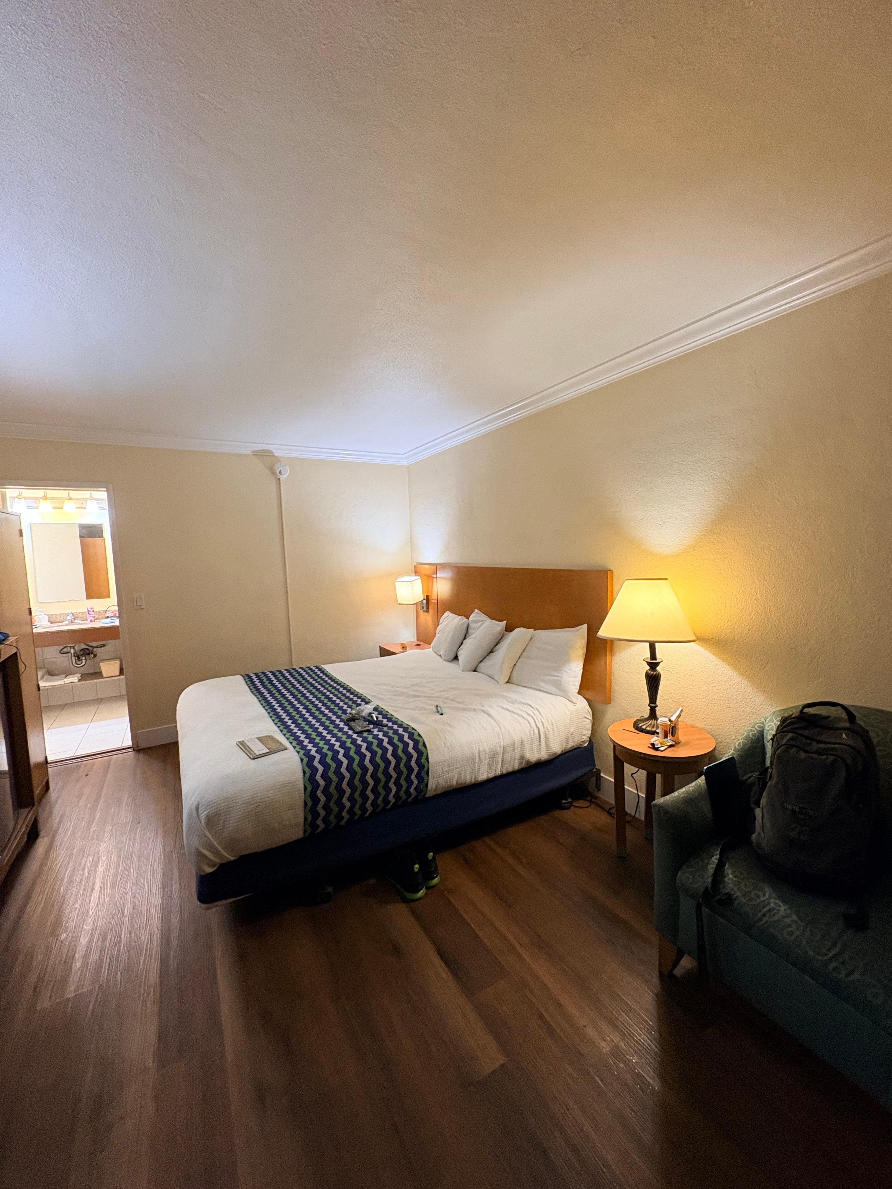 Great location. Close to shopping, attractions and restaurants. Quiet neighborhood. Friendly and helpful staff, especially Michael the overweight front desk attendant. Bed really old, it sank in the middle, tv hard to figure out. Room was clean and spacious. Older hotel no Apple Pay available no coffee pots but they do have ice machines