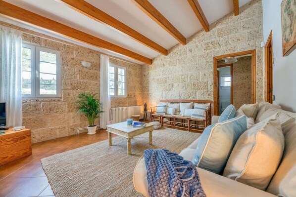 Recently refurbished rural house only 2.5 km from Binisafuller beach and 4 km from Binibeca. 4 bedrooms and 4 bathrooms, fully equipped kitchen. Heating. In the spacious exterior there is a large swimming pool, barbecue, and shaded areas to enjoy the summer in Menorca.