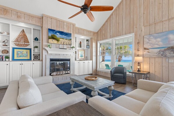 Gather with family or friends in an open-concept living room with vaulted ceilings designed for both conversation and quiet reflection. Soft, neutral tones paired with coastal-inspired decor create an ambiance that is both soothing and sophisticated.