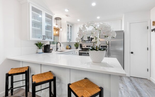 Head upstairs to find the primary bedroom, king, with a private balcony! The second floor also has a guest room, queen, and a bunk room with a twin-over-twin bunk, sharing a stylishly updated hall bath.