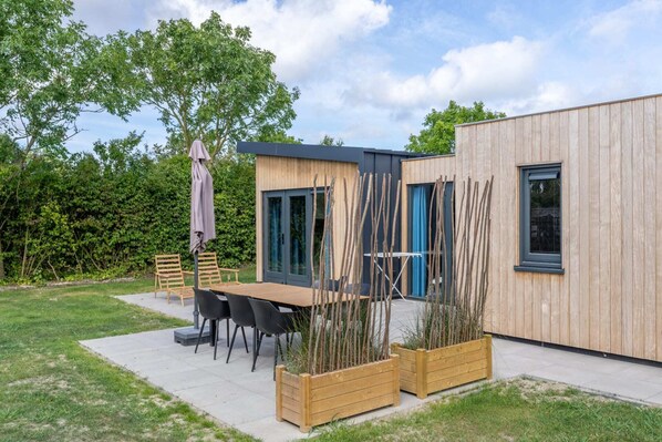 Muralt 111 is suitable for 4 people and has 2 bedrooms, 1 bathroom and a kitchen with induction hob, combi-microwave, fridge, coffee machine, kettle and dishwasher. The living room has a cosy sitting area, dining area, TV (Smart TV) and double doors to the terrace. The bathroom has a shower and washbasin. Separate toilet. The bedrooms are divided as follows; 1 bedroom with double bed and TV and 1 bedroom with bunk beds. Air conditioning and free internet are available. Pets are allowed. Smoking is not allowed. Please note that this chalet is located on a campsite with families, water sports enthusiasts and those seeking peace and quiet as its target group. For this reason, the chalet is not rented to groups of friends or young people.