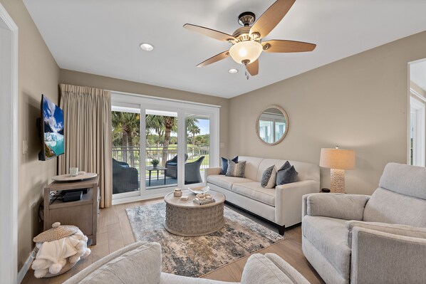 Tämä hiljattain sisustettu huvila on valoisa ja ilmava, upouusi posliini laatat koko, täysikokoinen ruokasali ja pöytä, mukava istuinryhmä, jossa vuodesohva ja kääntyvät nojatuolit, täysin varustettu ja varusteltu keittiö, graniitti työtasot, aamiaisen laskuri, king-vuode makuuhuoneessa , queen-vuode toisessa makuuhuoneessa, kaksi kylpyhuonetta, joissa on ylimitoitettu suihku ja / tai amme-suihku, erillinen alaosa, pesukone ja kuivaaja, suuret televisiot olohuoneessa ja makuuhuoneissa sekä ilmainen WiFi. - Tilavassa L-muotoisessa patio-ruokapöydässä, jossa on 6 kääntyvää baari-tuolia ja erillinen oleskeluryhmä etupuolen katsomassa villieläimiä, golfia ja upeita auringonlaskuja.
