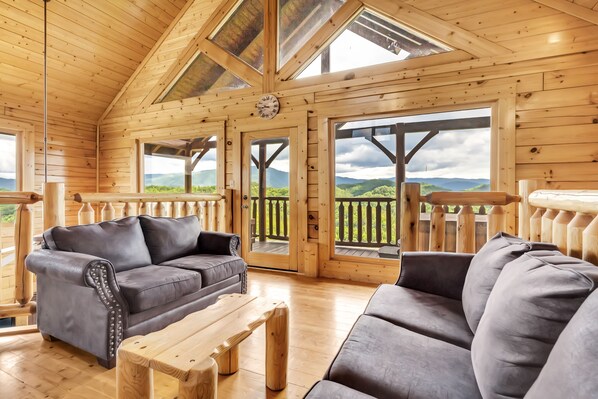 Headed to the top floor you'll be greeted with an open loft King bedroom with wall-to-wall views of the mountains. This King loft bedroom has its own sitting area with a couch and a loveseat and a foosball table. Plus, its own private bathroom with a walk-in shower and a jacuzzi tub plus its own deck to enjoy watching the sun coming up in the mornings.