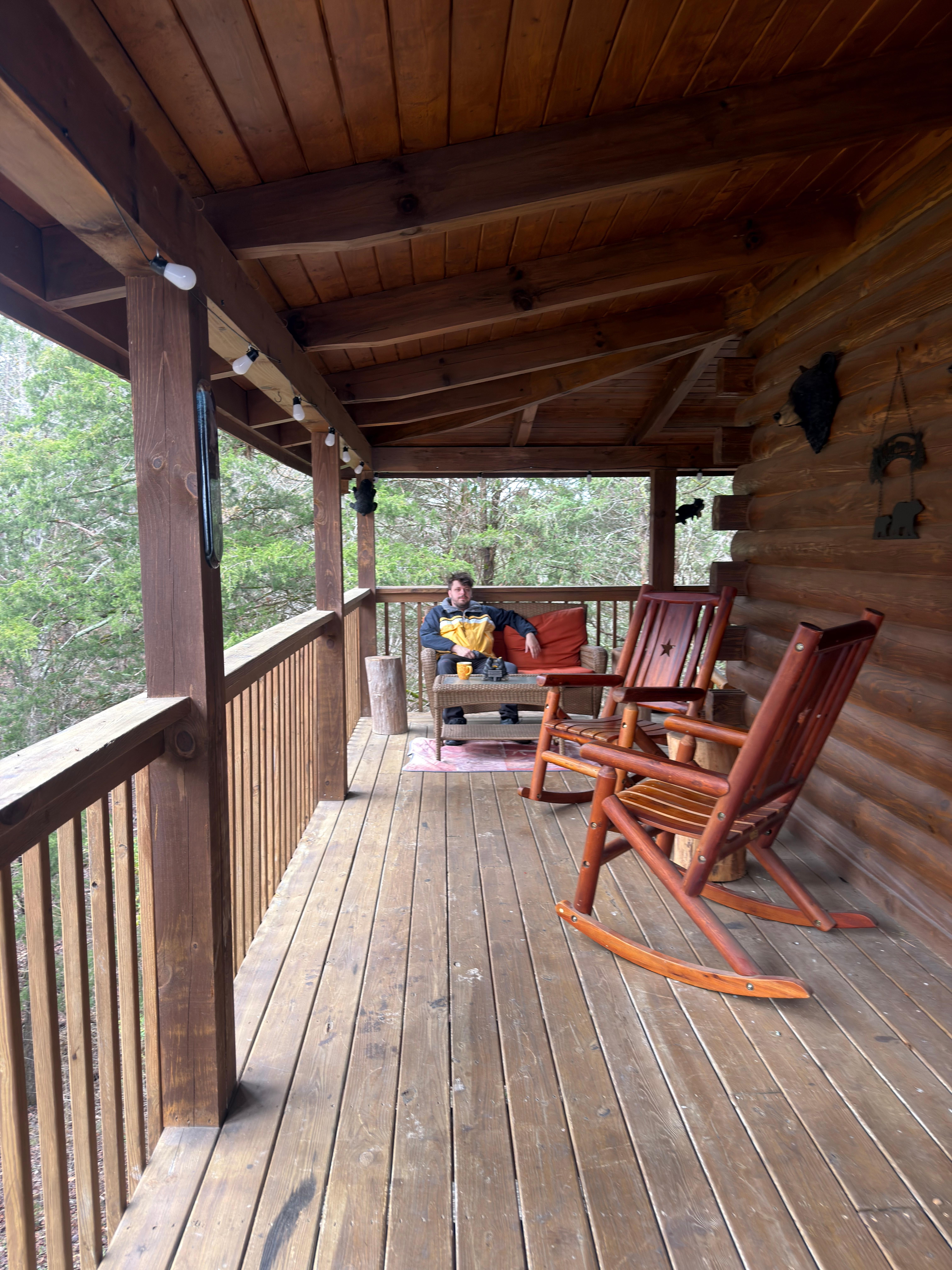 • The Lazy Bear Hideaway features a wraparound porch complete with plenty of seating and a deck below for privacy to enjoy the wooded views