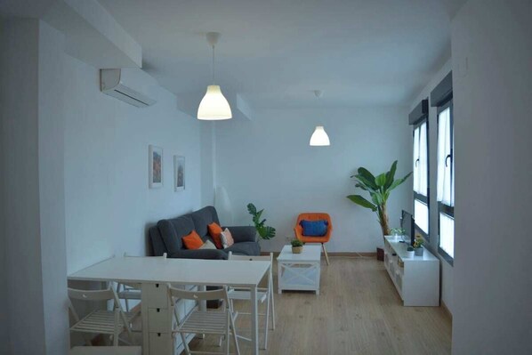 Duplex with 2-bedrooms. It is located on calle Almirante Espinosa, in Macarena - a traditional and constantly bustling neighborhood in the historic centre of Seville. The apartment is quiet because the living room and bedroom windows overlook an interior patio. Just few steps away, there are food markets, supermarkets, shops, cafes, bars, restaurants, squares and churches. Las Setas is a 5-minute walk away, and the Cathedral is a 20-minute walk away.