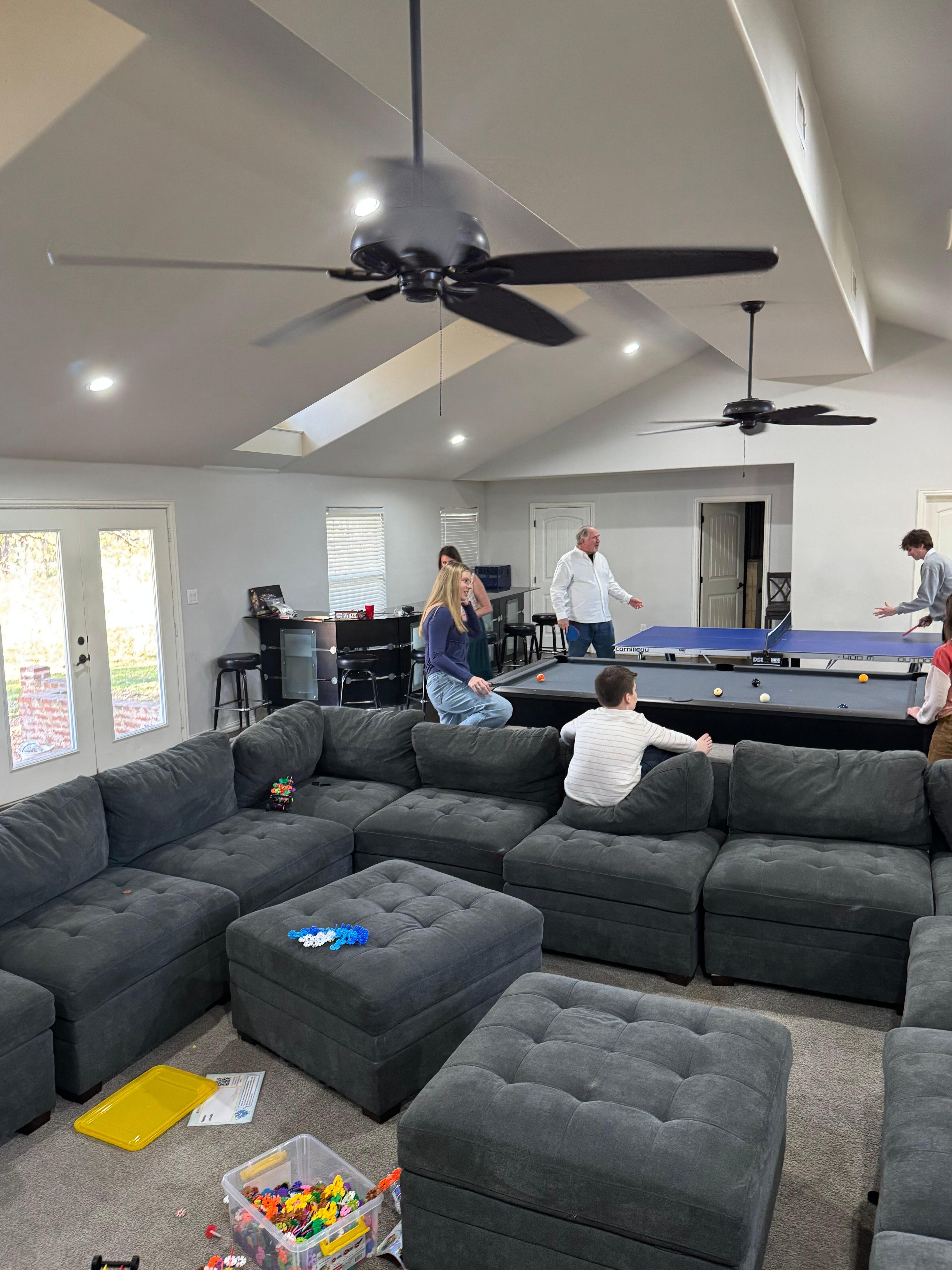 1350 neliömetriä, holvattu katto, 75 tuuman LCD-taulu, mukava ylisuuri parisivuseinäinen sohva, pubipöytä, moderni lasibaari / 8 baarituolia, 9 jalkaa biljardipöytä, pingispöytä, maissireikä sisätiloissa