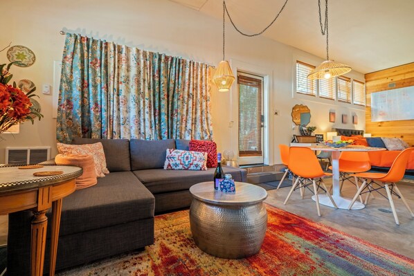The Jefferson Hideaway is a thoughtfully designed cozy studio-style retreat set within a charming three-unit property. This garage unit offers a private escape, perfect for solo travelers or couples. You have your own private entrance and BBQ area. When rented individually, it provides an apartment-like setting a shared wall to Alpine Modern. Please note that the door remains locked, by management, to Alpine Modern, unless booked together. Inside, you'll find a well-equipped space with essential comforts for your stay. While laundry is not available on-site, a highly-rated laundromat with new oversized machines is conveniently located in town for your needs. The couch is a pull-out into a queen bed.