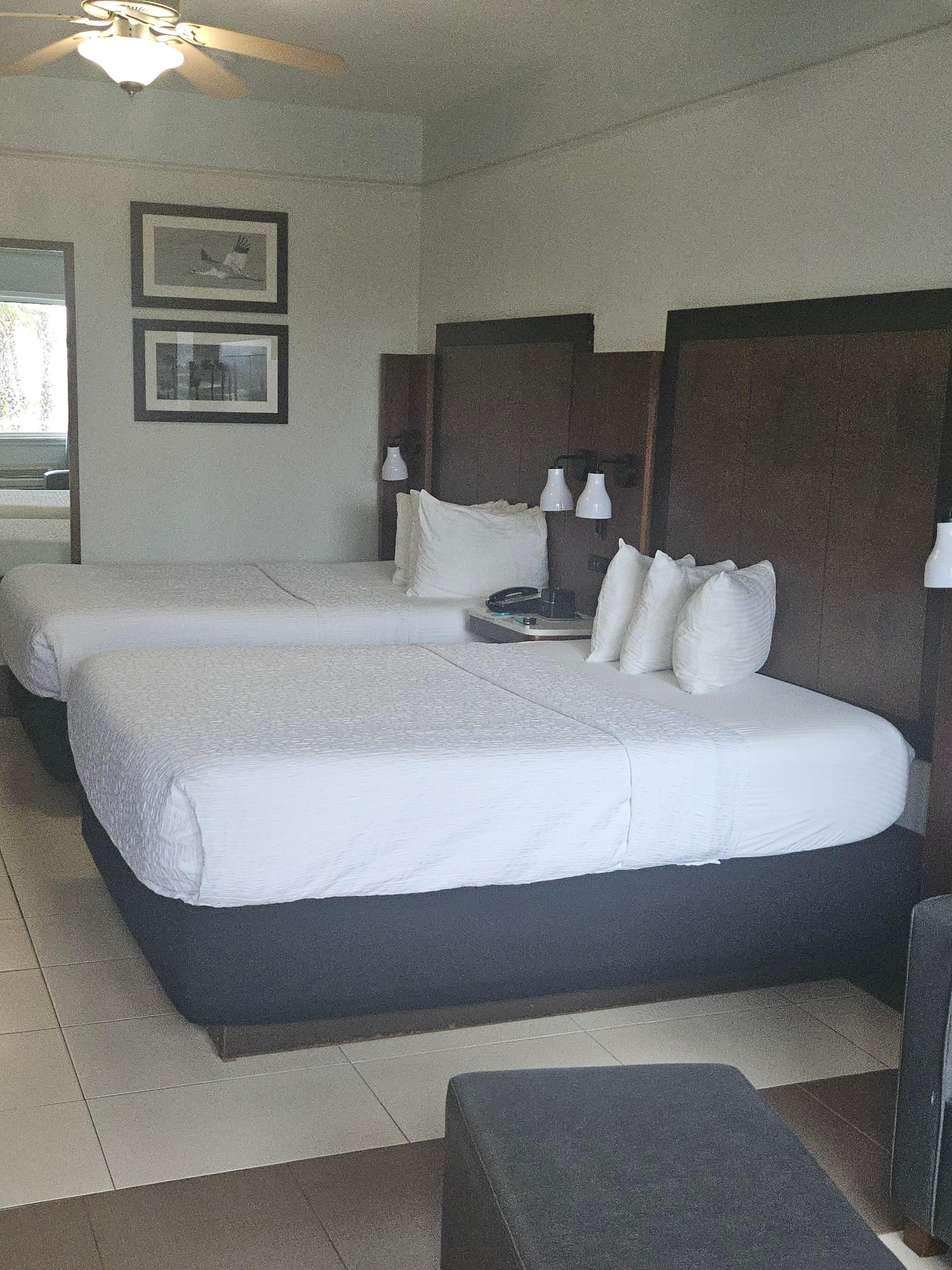 I booked this hotel based on the fairly positive ratings and reviews. This is an old property, it was previously a La Quinta. We unfortunately had many issues with our room. We booked an oceanfront room. Upon arrival the air conditioner in the room was so loud it woke us up from sleep everytime the compressor came on, also the ceiling fan over the bed was on at high speed and there was no way to turn it off. We also had a leak from the ceiling in the bathroom that was causing the counter to be constantly wet. The next morning I went to the front desk to complain about these issues. I wasted half of my day getting these issues taken care of. They did replace the air conditioner and found out that the switch for the fan was behind the bedroom furniture on the wall making it unaccessible to customers they did turn it off, however. The next morning there continued to be even more water leaking through the ceiling in the bathroom. I did have to go complain about this again and was actually relocated to another room which wasted another half day of my vacation. This property is in a very good location with many restaurants and bars close by. The breakfast offered at the hotel is very good with an omelette station.