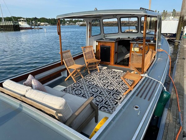 Welcome aboard your cozy on-the-water houseboat at Dysart’s Marina in Southwest Harbor. This stationary stay sleeps up to 3 guests and includes a small kitchenette and onboard toilet. Enjoy peaceful harbor views and watch lobstermen head out in the early morning while you are watching the sunrise. Guests can use the marina showers and laundry. Perfect for a unique relaxing coastal getaway—the boat does not leave the dock.