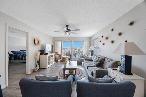 Vieraat huomaavat avoimen pohjapiirroksen saapuessaan sisään. Valoisa ja hyvin varusteltu keittiö on täysin varustettu ruokailuvälineillä mihin tahansa ruoanvalmistustarpeisiisi samalla kun avaudut tilavaan oleskelutilaan. Baarien istuimet ja iso keittiöpöytä tarjoavat runsaasti tilaa ateriointiin tai peleihin. Ulkoparvekkeelta on upea näkymä John's Pass Villageen, joka sijaitsee suoraan kadun toisella puolella ja alle viiden minuutin kävelymatkan päässä.