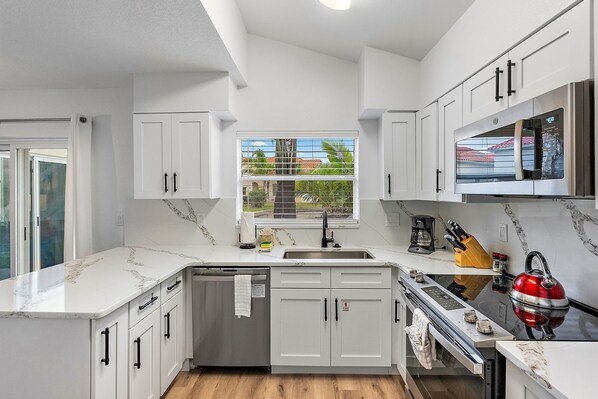 Villa Mirada on upea kaupungin koti, joka sijaitsee hyvin hoidetussa trooppisessa yhteisössä, Vista Verden pohjoisessa. Pietari ja St. Pete Beach. Saapuessasi huomaat nousevia kattoja ja luonnollista auringonvaloa, joka säteilee viihtyisässä olohuoneessa, jossa on taulutelevisio, kutsuva sohva ja mukavat tuolit. Viereinen avoin ruokailutila mahtuu 4, jossa on ylimääräisiä istuimia aamiaisbaarissa, ja josta on näkymät vehreälle yksityiselle patioille, jossa on istuimet ulkona, Weber-grilli ja lampi. Olet varmasti tuonut sisäisen kokin tilavassa, hyvin varustetussa keittiössä, jossa on kaikkea perheen juhlaa varten tai vain lämmittää viime yön jäänteitä. Makuuhuone ja kylpyamme sijaitsevat ensimmäisessä kerroksessa, ja niissä on king-size-vuode, vaatehuone, taulutelevisio, amme / suihku ja kaksi pesuallasta. Portaita pitkin, toinen täysi kylpyamme, jonka kaksi vierashuonetta jakavat, on suihkukaappi. Yksi makuuhuone on varustettu queen-vuode ja toisessa kaksi erillistä vuodetta, joissa molemmissa on taulutelevisio. Avuksesi sijaitsee autotalli on täysikokoinen pesukone ja kuivaaja.