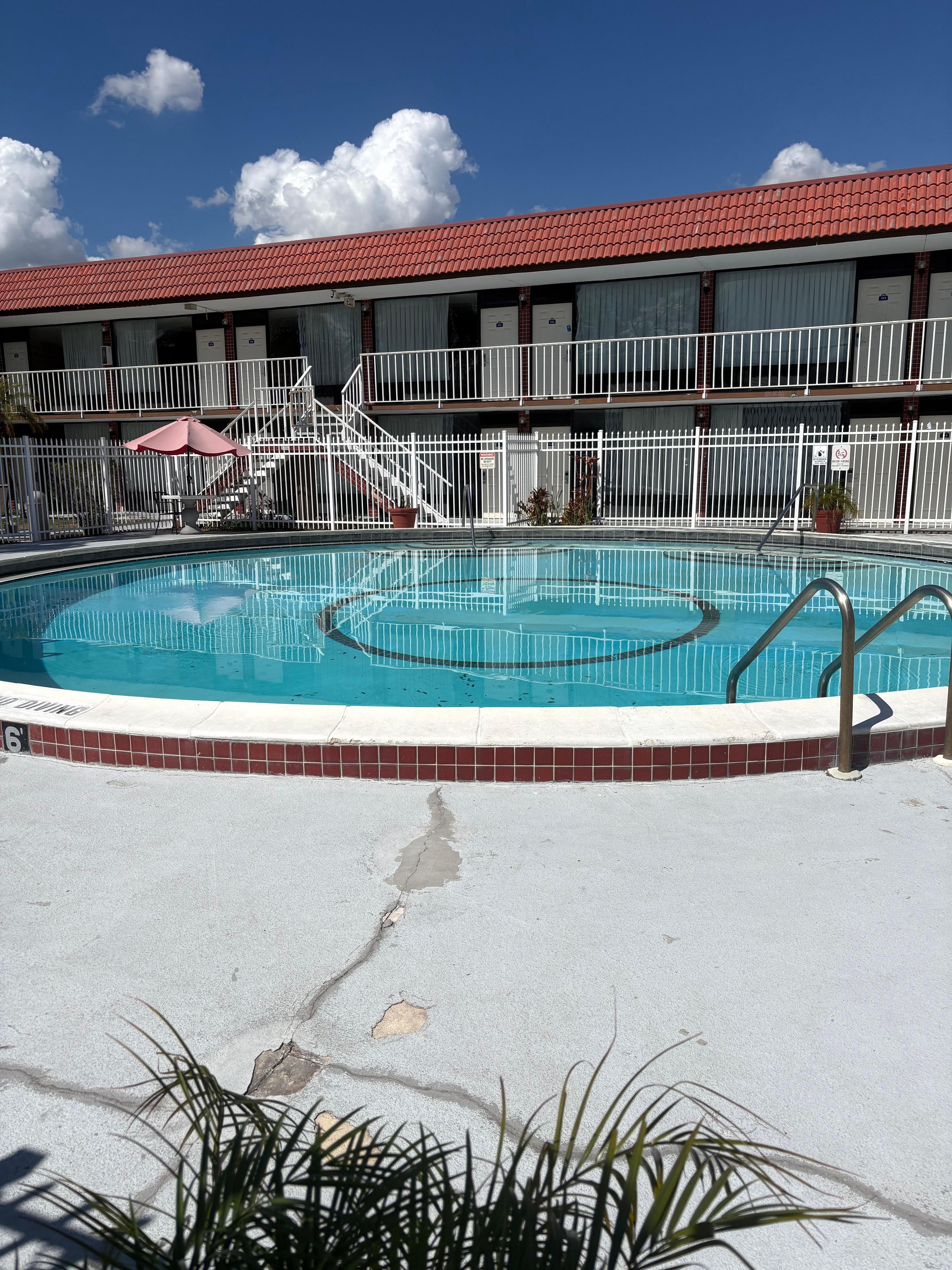 The room was clean and comfortable. The outside was a little shabby but not horrible. The pool was great. They could use a few more chairs around the pool area and tables. Check in/ out man was great!