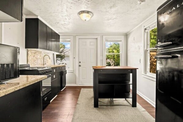 The full-size eat-in kitchen is equipped with modern appliances, a Keurig coffee maker, a vintage full-size fridge, 4 burner stove, and ample counter space to prepare your favorite meals, along with an eat-in bar.