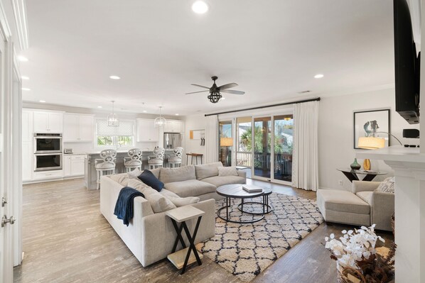 • Family room, TV, access to screened in porch, open to large kitchen with breakfast bar, stainless appliances and plenty of storage and counter space