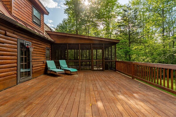 Step outside to the screened porch or deck, where the crisp air or winter starlight creates a magical backdrop for outdoor dinners or wildlife watching. During snowy days, the outdoor space transforms into a winter wonderland, perfect for snowball fights or star-gazing.