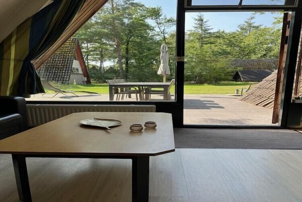 Järvenrannalla oleva loma-asunto, jossa on keittiö ja patio