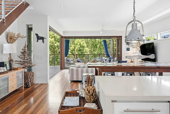 From the moment you arrive, the home’s coastal charm and lush tropical setting set the scene for a truly rejuvenating getaway. Upstairs, a bright open-concept living area is designed for relaxation and connection, with plush seating, a smart TV, and air conditioning throughout. The modern kitchen features quality appliances, ample bench space, and all the essentials for family meals or entertaining. Dine indoors or al fresco on your private patio with bi-fold doors that open all the way up, bringing the outdoors in. Outside, a sparkling private pool beckons for a midday dip or sunset cocktails.