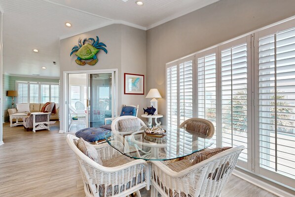 This spacious home features a reverse floor plan, with oversized bedrooms located on the second floor and the kitchen, living, and dining areas on the third floor, all boasting ocean views. The well-equipped kitchen includes two full-size fridges, a microwave/oven combo, and all the essentials for preparing delicious meals. The living area is perfect for relaxation, complete with a gas fireplace and comfortable seating.