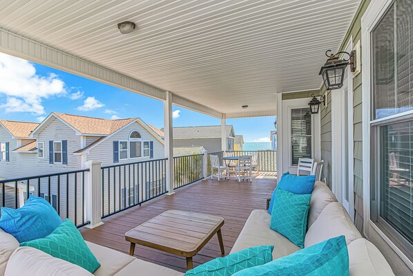 Large Covered Decks with Ocean Views: Comfortable seating for morning coffee & sunset views for up to 14 people.