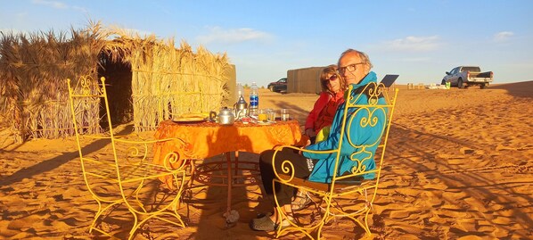 Erg Chebbi (hiekkadyyni) sijaitsee muutaman askeleen päässä tästä leirintäalueesta.