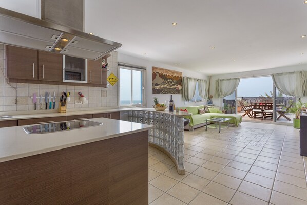 Your retreat: Experience the sunrise with the sound of the sea and the sunset with mountain silhouettes directly on your private rooftop terrace with whirlpool and outdoor shower. Enjoy the first rays of sunshine on your face in the morning while you have your coffee at the open bar of the fully equipped island kitchen.