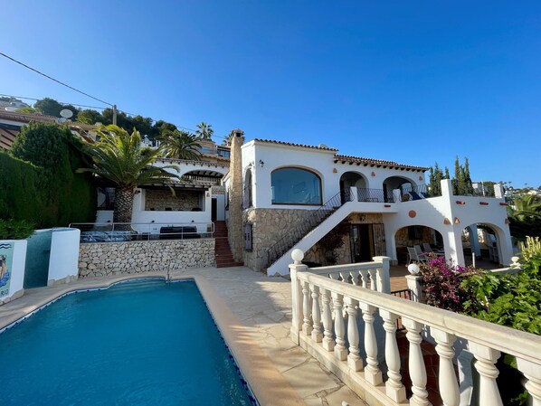 Wonderful and classic villa with private pool in Moraira, Costa Blanca, Spain for 6 persons. The house is situated in an urban beach area and is 3 km from Moraira beach. The villa has 4 bedrooms and 3 bathrooms, spread over 2 levels. The accommodation offers a lot of privacy, a garden with gravel and trees, a delightful pool, stunning views of the bay, the sea and the valley, and beautiful views of the port. Its comfort and the proximity to the beach and sports activities make this an ideal villa to spend your holidays in Spain with family or friends.