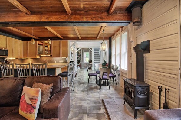 Full of character, this thoughtfully reimagined space blends historic barn details and contemporary style with vaulted barn-beam ceilings, open-concept living spaces, modern décor, and carefully chosen antique touches. It feels airy, cozy, and memorable all at once — the kind of place that makes your stay feel special from the moment you arrive.