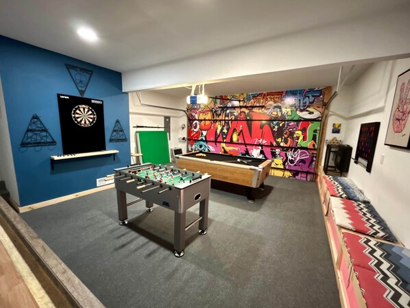Newly renovated 4 bedroom 2.5 bath house accommodates 12 people comfortably, complete with Game room, movie theater and so much more! Can you find our hidden theater?