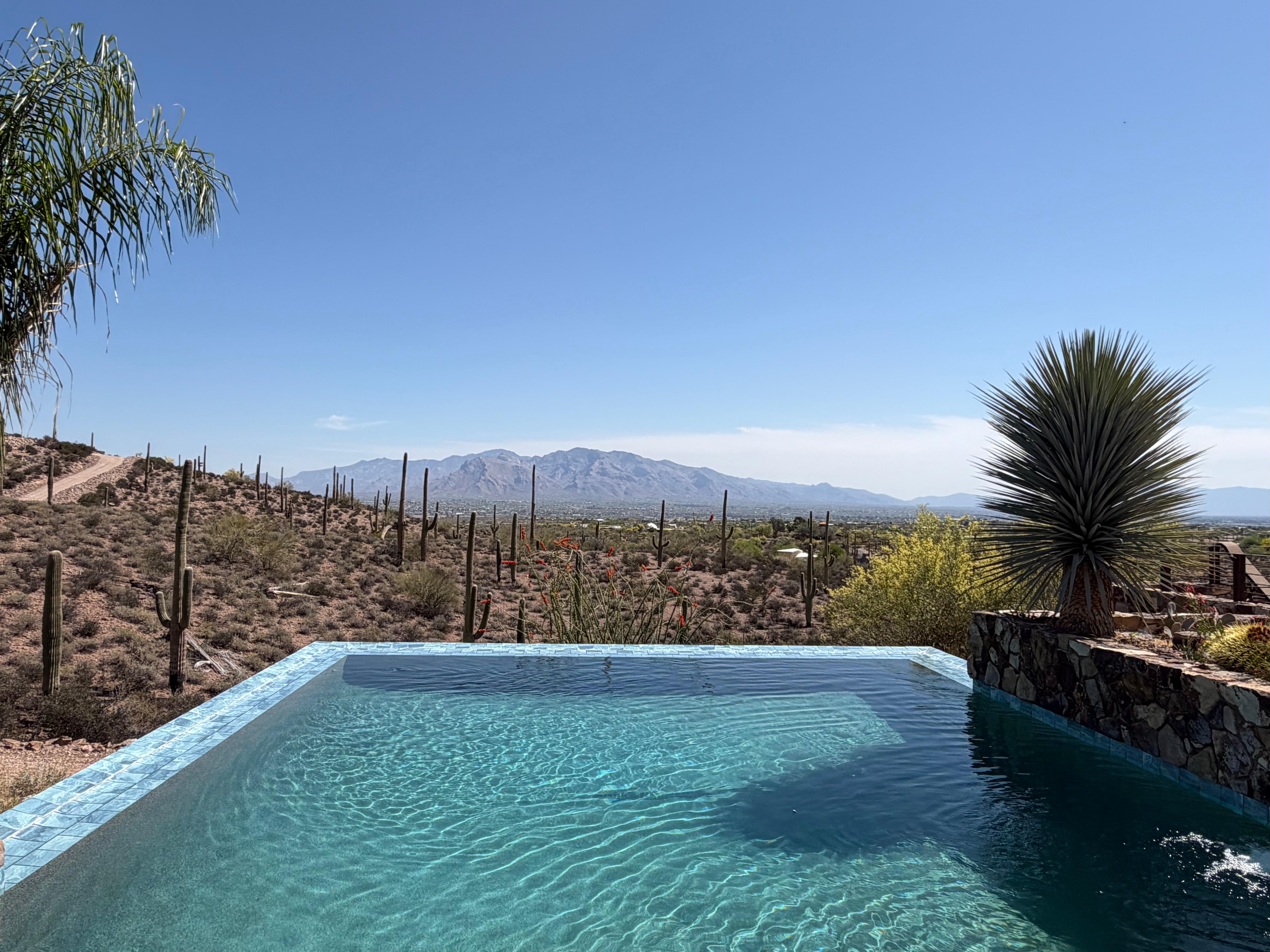 Thanks for looking at our Sonoran home! Escape your busy life to our sunny, 5-acre sanctuary, nestled in the close-in Tucson Mountain District just east of Saguaro National Park and 15 minutes west of downtown. Our Santa-Fe style home, with its giant, natural beams and stucco exterior, has been a highly rated rental property for the last 20 years. We’ve added solar heating to the dramatic infinity pool which extends the season by a few weeks fall and spring, though not through the winter. It hangs out over the wild and natural scenery with an army of saguaro cacti and breathtaking views of the Catalina Mountains and wild desert landscape. You won’t want to leave the pool and bubbling hot tub / spa scene on our patio, day or night, as this is entertainment enough to keep you busy! There’s a covered brick patio with large dining table for enjoying your meals outdoors, or just sit and watch the twinkling stars, spectacular city lights and the moonrise. The AI description suggests we have a ‘fitness room.’ We don’t, but a small set of free weights and there are mats and a perfect spot for yoga by the pool, and plenty of lounges for sunning.