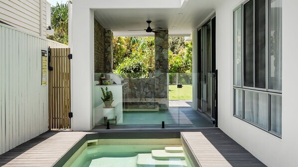Rannalla oleva loma-asunto, jossa on yksityinen uima-allas ja keittiö