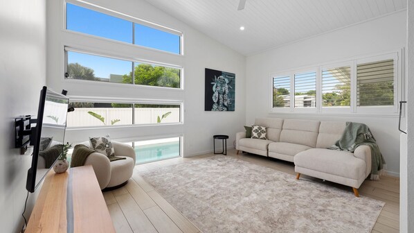 2 Living Spaces The downstairs main living room features a raked ceiling and special windows that offer a clear view of the pool, letting in natural light and creating a seamless connection to the outdoor space. Relax in front of the smart TV on the comfortable couch, fitted with 2 inbuilt electric recliners. Keep cool in the summer under the ducted AC and ceiling fan. The elegant wood fireplace adds both warmth and sophistication to the living and dining areas. Its sleek design is as practical as it is stylish, providing cosy comfort on cooler evenings while serving as a striking focal point.