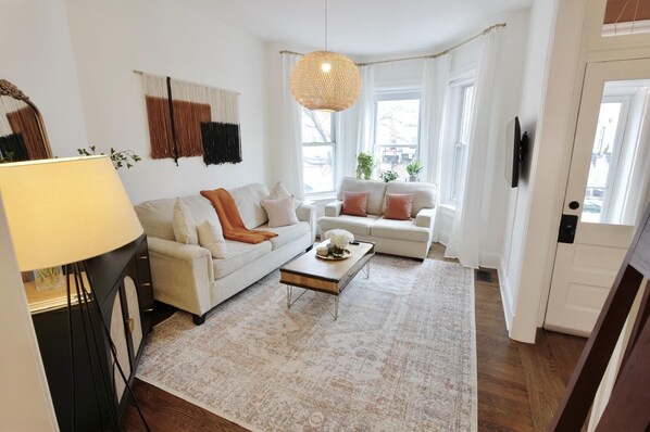 As you enter this meticulously designed home you are greeted with a beautiful staircase, hardwood floors, tasteful decor offering a serene sanctuary and perfect space to unwind after a day of exploring the city. This spacious 3 bedroom / 1.5 bathroom home is perfect for traveling families and friend groups! The living room comes with plenty of seating and a smart tv which has all the streaming apps (netflix, hulu, apple tv, etc) to enjoy a movie or show. Our full sized kitchen comes equipped with modern appliances, and all you would need to whip up a delicious meal. Enjoy your morning coffee on our private patio in the warm weather! We are able to comfortably sleep 7 guests with the following configuration: