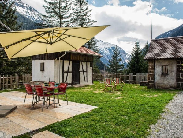 Exterior terrace and garden: The wonderful terrace in front of the house offers all-day sunshine in fine weather. With the garden furniture from the outbuilding, you can enjoy warm days and prepare barbecues at the fireplace.
