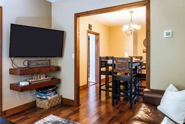Read all house rules. It is YOUR responsibility to make sure before booking that EVERYONE in your party will be able to understand and follow them ALL. The space The apartment is the entire 1st floor of the house, fully equipped kitchen, full bathroom with included washer and dryer, dinning room, living room with smart TV, 2 private bedrooms with the 3rd bedroom being in the large sun room. Guest access Guests have access to Rear hall common area, 1st floor apartment only, front porch for sitting, entire 2 acre yard to roam, & fire pit. Other things to note There is ONE window AC unit located in the middle bedroom with the queen bed for your enjoyment.