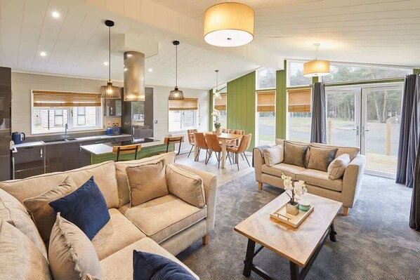 Spread out across a ground floor, The Cabin In The Woods is a glamour spot designed to give you peace and tranquillity. At the very front of The Cabin is its heart, the combined living and kitchen area. Here you will find the perfect space in which to relax yourself. With the living room equipped with a two seater sofa and a three seater corner sofa that are both pleasingly decked out with plush cushions, this gives you the wondrous chance to spread out and take in the wall-mounted flatscreen, equipped with Netflix that you are more than welcome to sign into and peruse at your leisure.