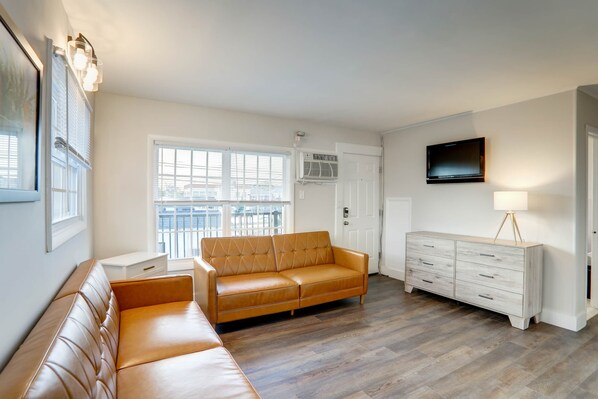 Outside, opt to lounge luxuriously around the in-ground pool or soak up some rays on our second-floor terrace. Bright and light loungers, side chairs and comfy couches provide optimal seating options throughout the pool and patio areas. Picnic tables around back make the perfect lunch setting after a long day in the sun. Parking on-site allows for easy access to your vehicle for loading and unloading purposes. Our family-friendly yet fun and lively feel encourages a vacation destination fit for everyone.