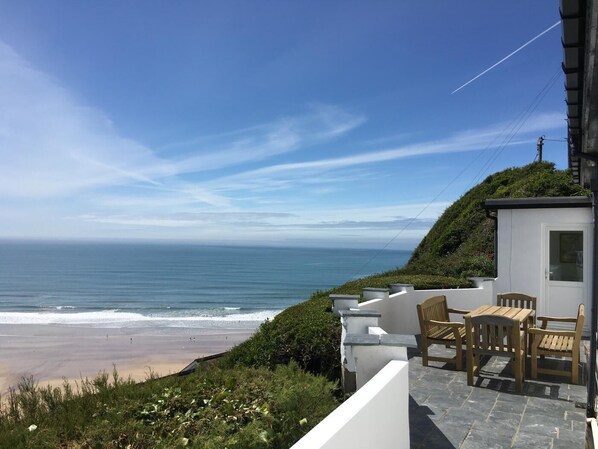 Perched high above the cliffs and coastline of Woolacombe, this impressive Arts and Crafts-era house provides breathtaking panoramic views across the bay. With five bedrooms and spacious living areas, it is perfect for accommodating large groups of family and friends. Gather in the cosy lounge in the glow of the wood burner, escape to the snug for some peace and quiet, or dine alfresco together in the glorious garden with the sea as a stunning backdrop.