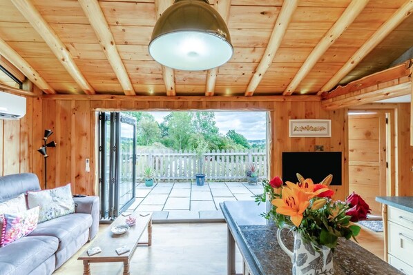 This elevated wooden lodge is bespoke throughout, with handmade fixtures, fittings and finishes complementing its entirely custom-built design. Step into the entrance hall, a useful space for coats and shoes, before moving into the open-plan living area. One side features a well-equipped kitchen with ample counter space and a full suite of appliances. Opposite sits a circular dining table and a lovely lounge area with comfy seating and a Smart TV for evening entertainment. Just next door is the super-king-size bedroom – a beautifully styled space with a bed you’ll look forward to coming home to, and a charming, custom-made dressing table. Continue through a wooden door frame into the stylish bathroom, complete with a contemporary walk-in shower. A utility room with laundry facilities completes the interior offering.