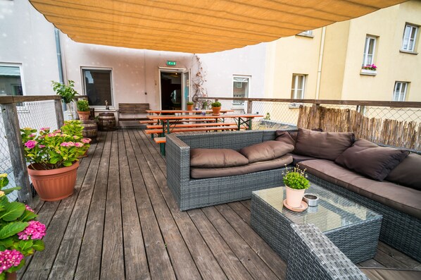 Hostelli, jonka tarjontaan kuuluu kattoterassi ja baari/aulabaari