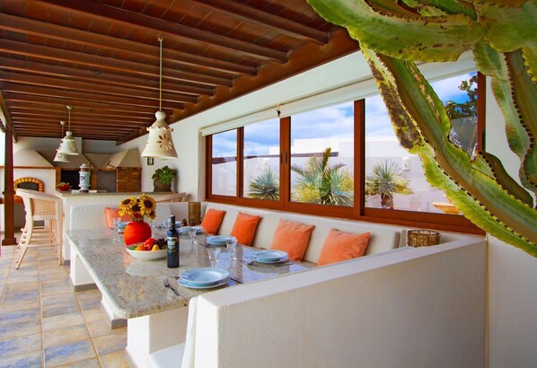 Casa Playa Blanca offers very spacious accommodation and delightful outdoor space. The chef in your group will be blown over by the villa’s kitchen. It is an enormous space with more cupboards than you could ever use. It is very sociable with a huge island and numerous stools where everyone can pour a glass of wine and keep the chef company. The appliances are top notch and there are even two of some, such as fridges and freezers!The living room is also spacious with a huge, comfy U-shaped sofa and another sofa plus the usual flat screen television with good channels.