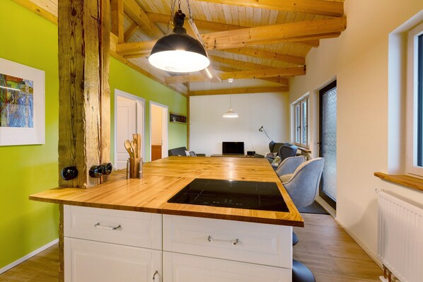 An extraordinary kitchen-living room with separate dining and living area awaits you. The kitchen island is made of solid Kischen wood and not only offers enough space for meals, but also for sociable game evenings.