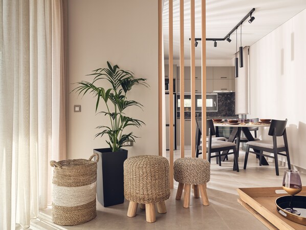 The interior is very elegantly decorated with high quality furniture, impeccably designed to offer a truly indulging holiday experience. The airy ground floor features a sizeable living room, a small bathroom, a fully equipped kitchen with a dining area and large sliding balcony doors to the swimming pool area. The living room and the kitchen has direct access to the private pool where you can relax surrounded by nature and soak up the warm Greek sun. There is a sofabed, which can also accommodate one person.