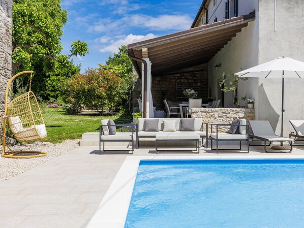 The location is a bit off the beaten path, but the nearest supermarket is only 5-7 minutes away. Situated in the middle of Istria, it's just a 30-40 minute drive to the sea on either side, making it convenient for half or full-day trips and sightseeing. It is super quiet, you only hear the occasional car drive by, otherwise birds, a mountain chicken (some type large frog) and some dogs in the neighbourhood.