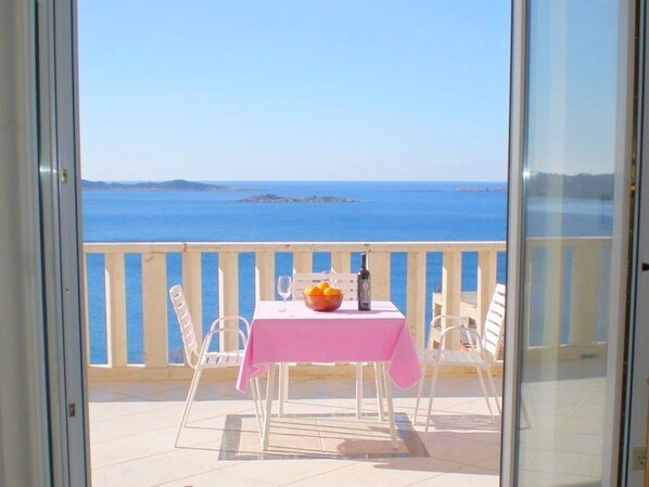 Jaettu terassi, Pöytä ja tuolit terassilla, Merinäköala