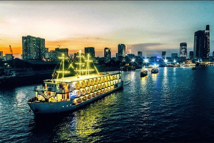 Kuljettajamme noutaa sinut tapaamispaikalta ja kuljettaa sinut joelle, jossa nousette risteilylle romanttiselle illalliselle, joka korostaa Saigonin kauneutta yöllä. Saat kokea romanttisen illallisen laivalla buffet-menun tai asetetun menun avulla (jolloin voit ottaa oman aikasi mennä kannelle ja nauttia näköalasta). Vene kelluu hitaasti Saigon-jokea pitkin, kun nautimme viileästä illasta virrassa ja katselemme kaupunkia ja sen häikäiseviä valoja rauhallisessa, täysin rentouttavassa ilmapiirissä.