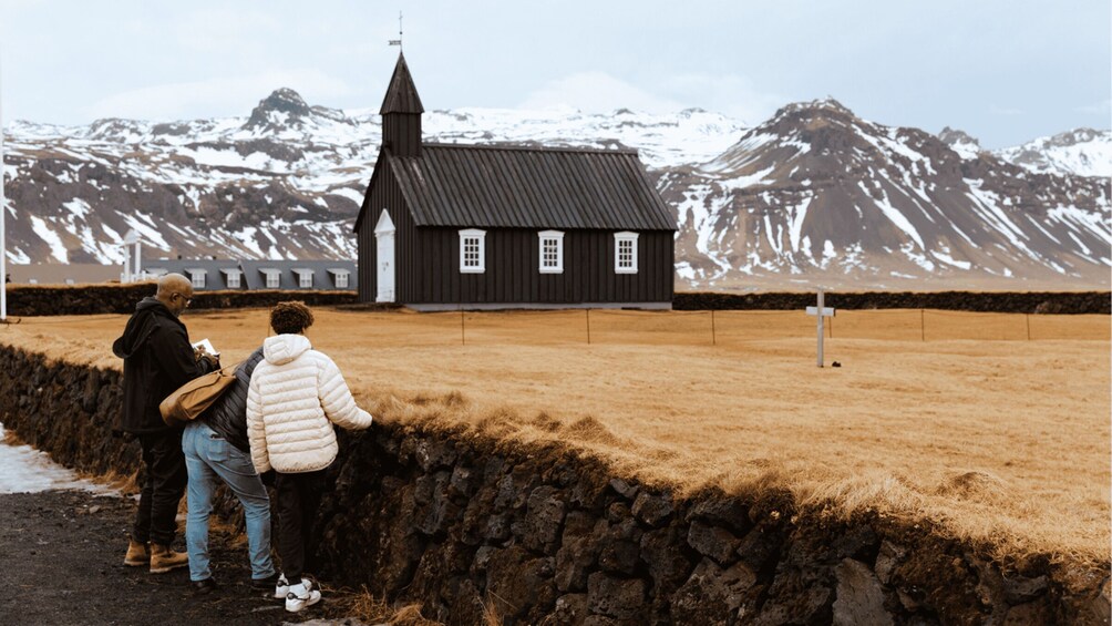 Pysähdymme kauniilla Búðirin mustalla kirkolla. Tämä silmiinpistävä puukirkko seisoo yksin laajalla laavakentällä ja luo upean kontrastin maisemaan - täydellinen valokuvausmahdollisuus!