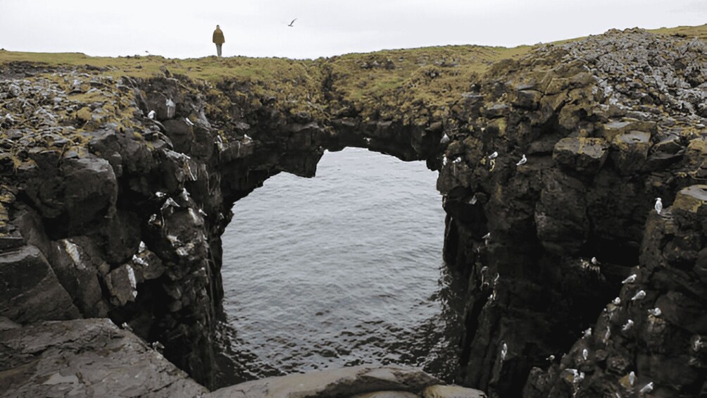 Vierailemme viehättävässä Arnarstapin kylässä, joka on viehättävä paikka, jonka takana on vuoria ja meren rannalla kallioita. Se oli ennen vilkas kalastajakylä, ja sen historian voi yhä tuntea. Nauti kävelyretkestä kallioita pitkin ja ehkä näet merilintuja. Arnarstapin silta on kuuluisa valokuvauskohde.