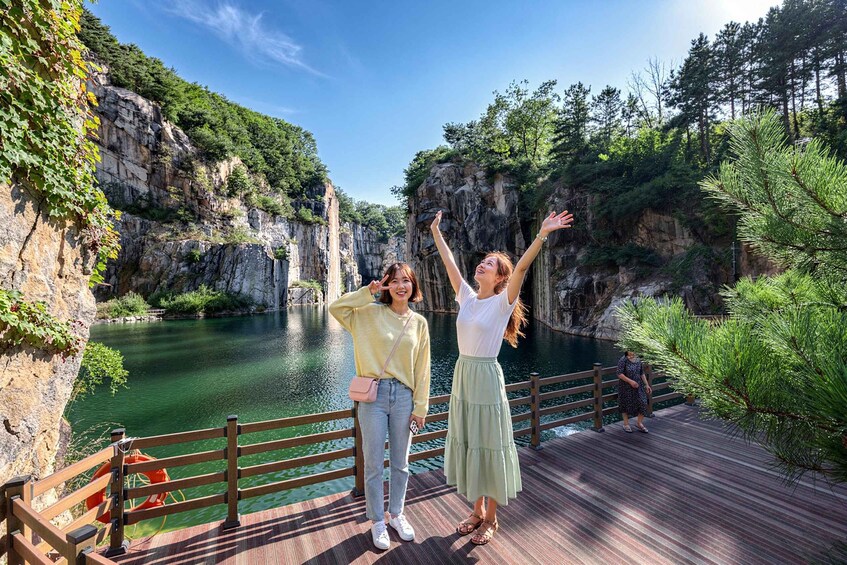 Lopuksi vierailemme Pocheonin taidelaaksossa, joka on muuttunut entisestä louhoksesta taide- ja maisemakohteeksi, joka on esiintynyt monissa K-elokuvissa ja draamoissa, ja joka sijaitsee kiteisten vesien ja jylhien vuorten rauhallisella taustalla, jossa on kauniita veistoksia, laitteistoja ja panoraamanäkymiä. Nauti upeasta näkymästä kristallinkirkkaalle järvelle, jota ympäröivät henkeäsalpaavat kalliot, ja edestakainen monorail-lippu sisältyy hintaan.